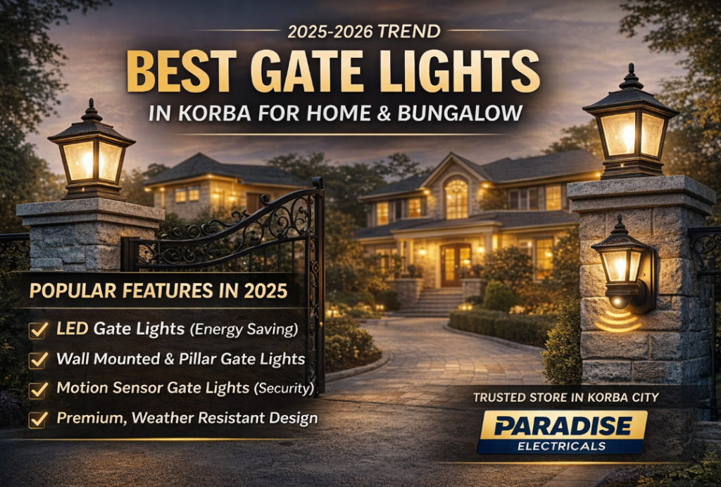 Korba City में Home और Bungalow के लिए Best Gate Lights आपको भरोसेमंद Paradise Electrical ke Store पर मिल जाएंगी, जहां आपको लेटेस्ट 2025 डिज़ाइन, सही रेट और इंस्टॉलेशन गाइडेंस भी मिलता है।